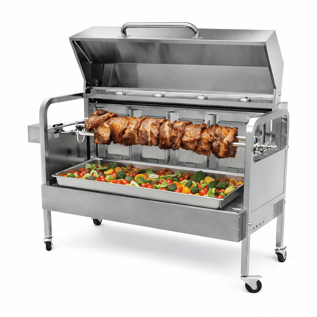 Chcete gril, který zvládne opravdu pořádné kusy masa a přitom se obsluhuje snadno jako klasický plynový gril? Tento plynový rožňový gril z nerezu je ideální pro přípravu malého selátka, kýty, krůty i více kuřat najednou. Díky motoru a rotisserie jehle (rožni) se maso otáčí plynule a rovnoměrně – výsledkem je šťavnatý střed a dokonale křupavá kůrka, přesně jak to má u sele nebo kýty být.