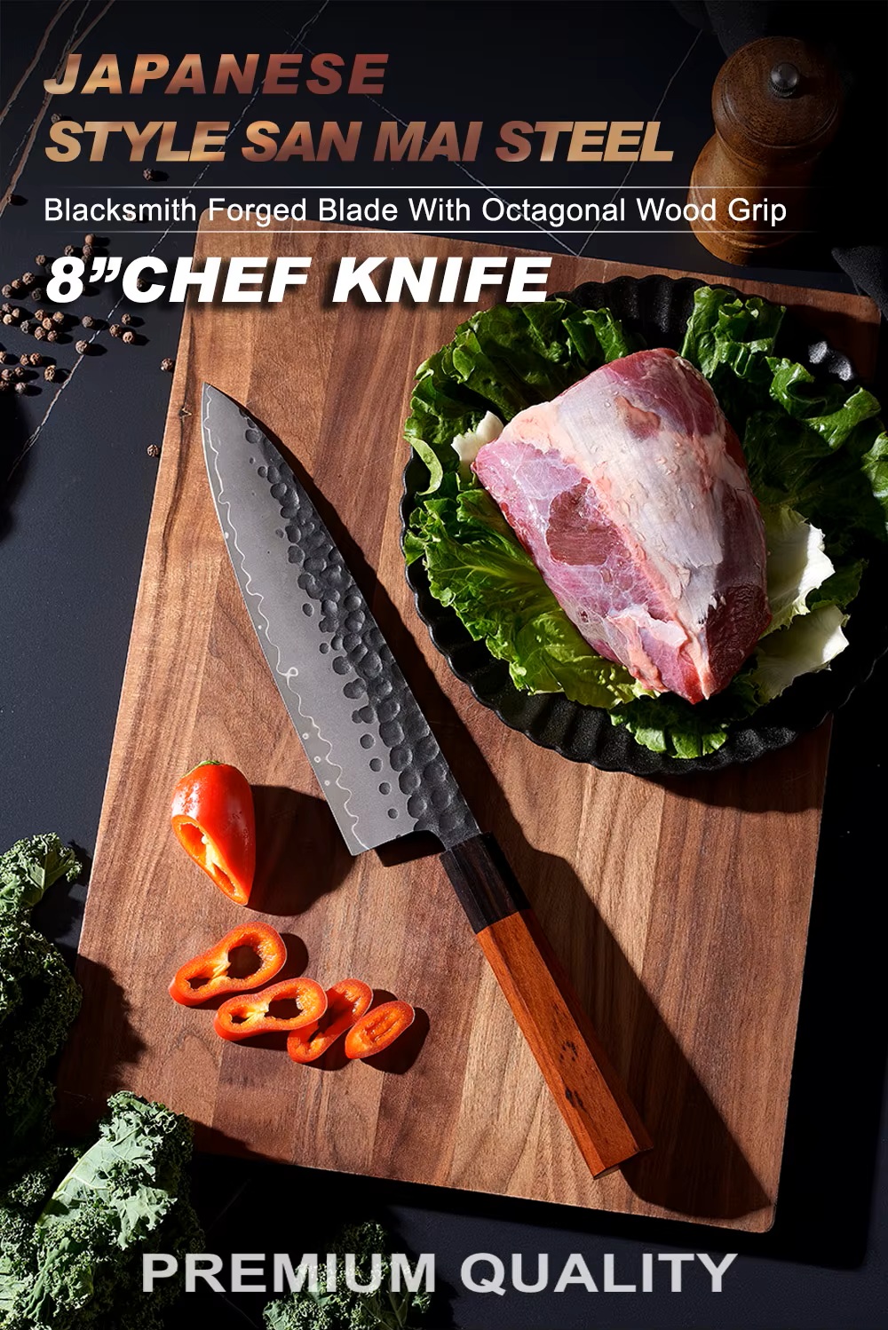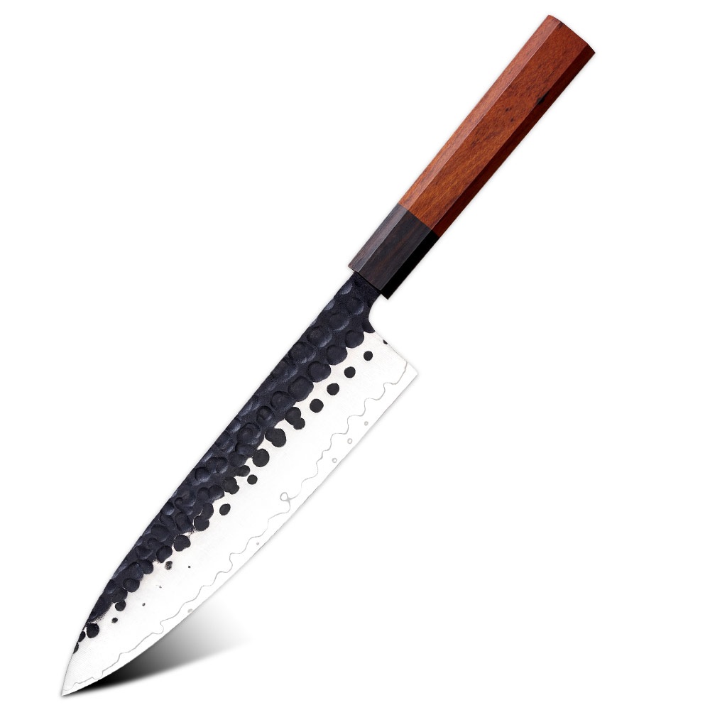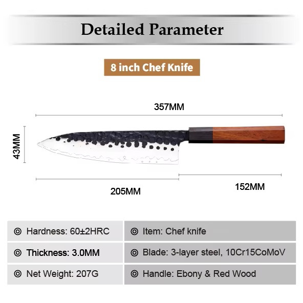 Nůž má osmihrannou rukojeť vyrobenou z ebenového a červeného dřeva, která poskytuje pevnost i pohodlí.