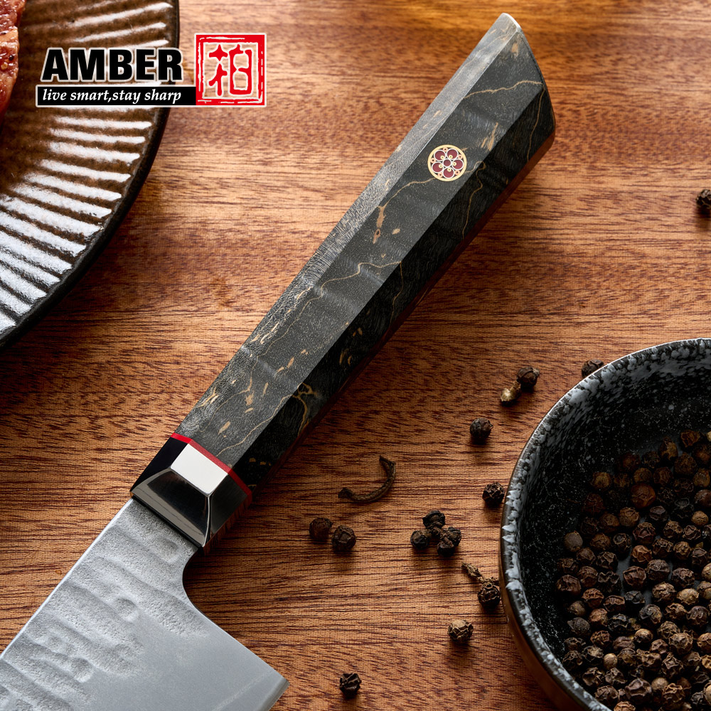 Nůž má osmihrannou rukojeť vyrobenou z nerezové objímky a burl dřeva, která poskytuje pevnost i pohodlí.
