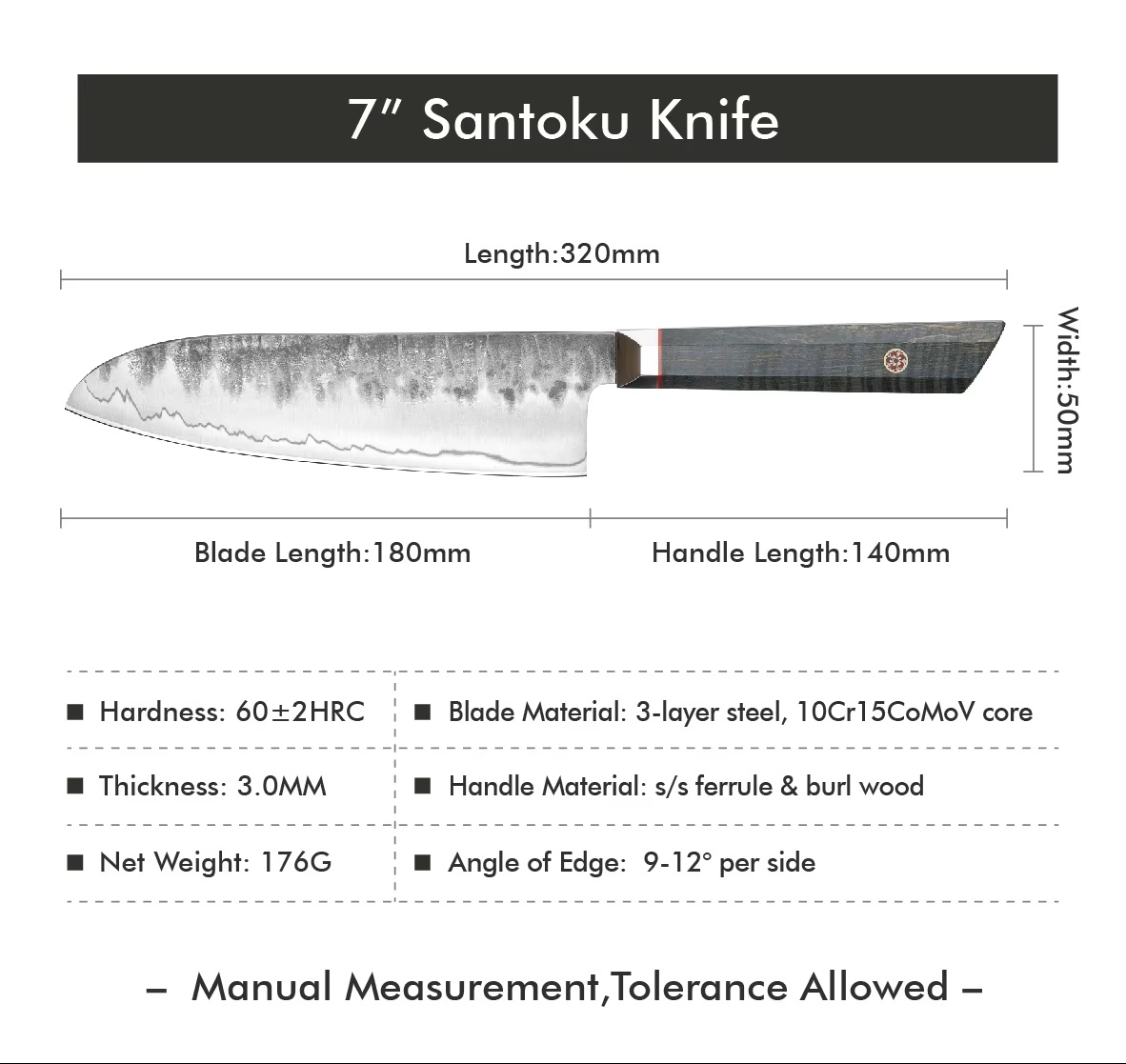 Nůž má osmihrannou rukojeť vyrobenou z nerezové objímky a burl dřeva, která poskytuje pevnost i pohodlí.