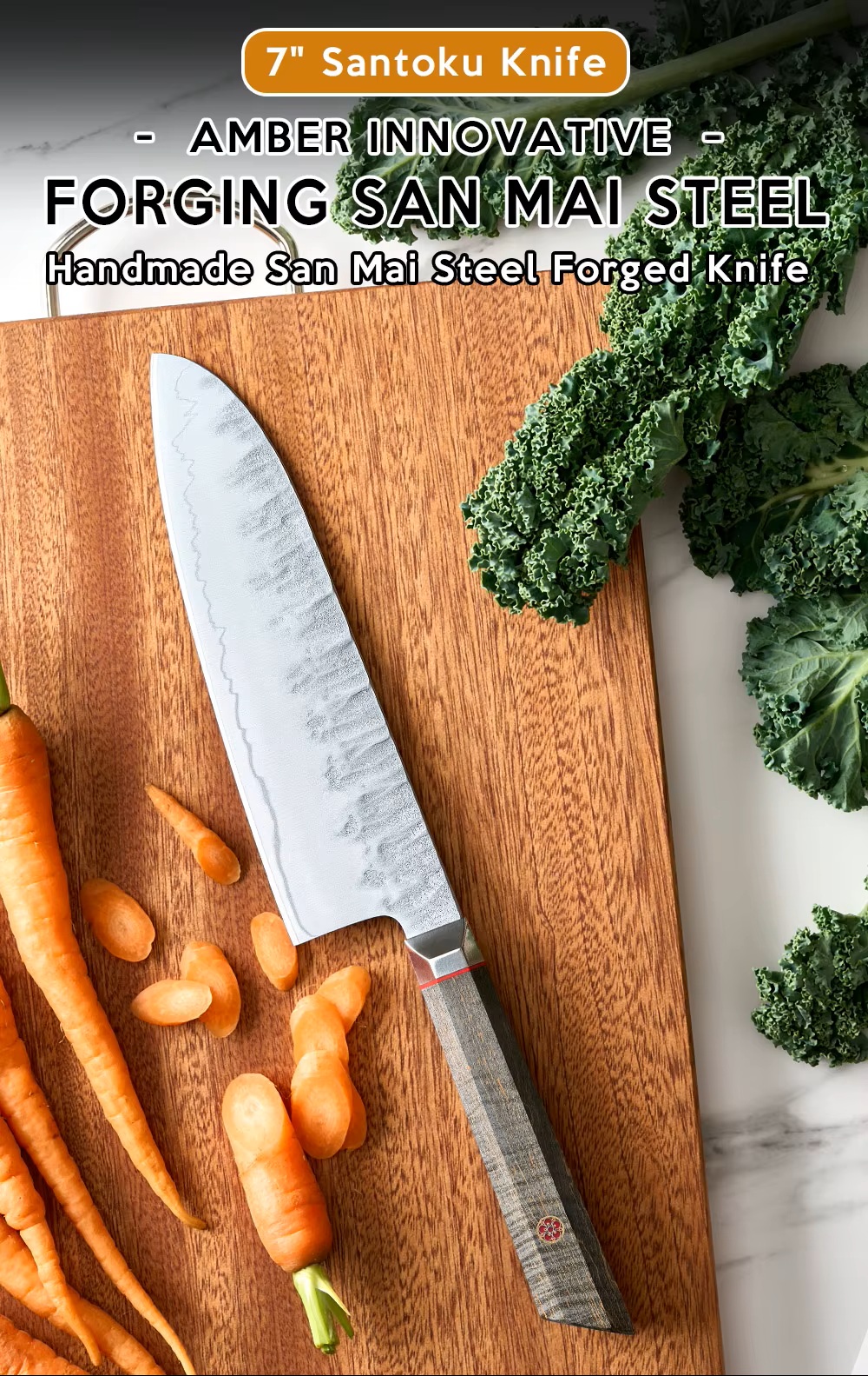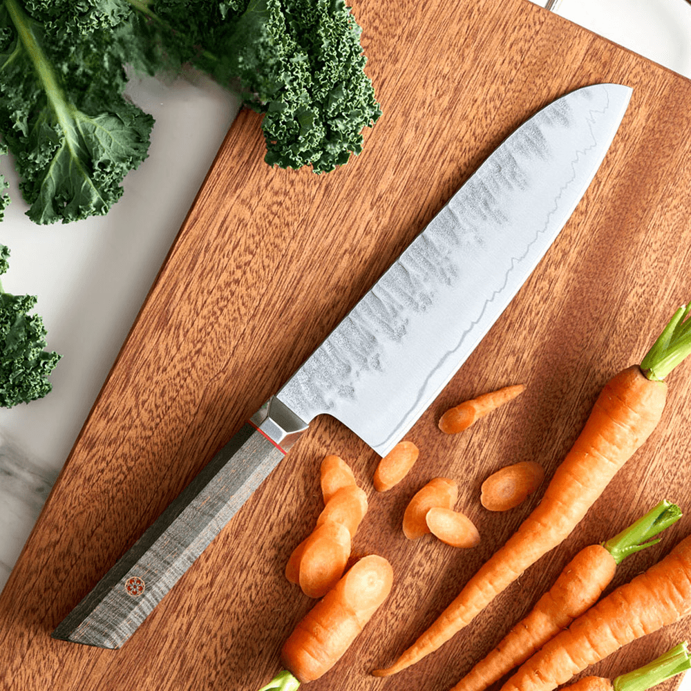 Nízký profil čepele: Čepel nože Santoku má obvykle nižší profil než některé západní nože, což umožňuje blízký kontakt mezi čepelí a krájecí deskou.