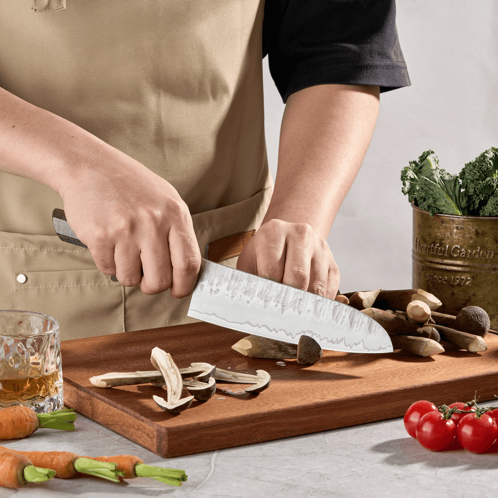 Všestrannost: Nůž Santoku je univerzální a může být používán pro krájení masa, ryb, zeleniny a dalších potravin. Jeho design usnadňuje náročné kuchařské úkoly.