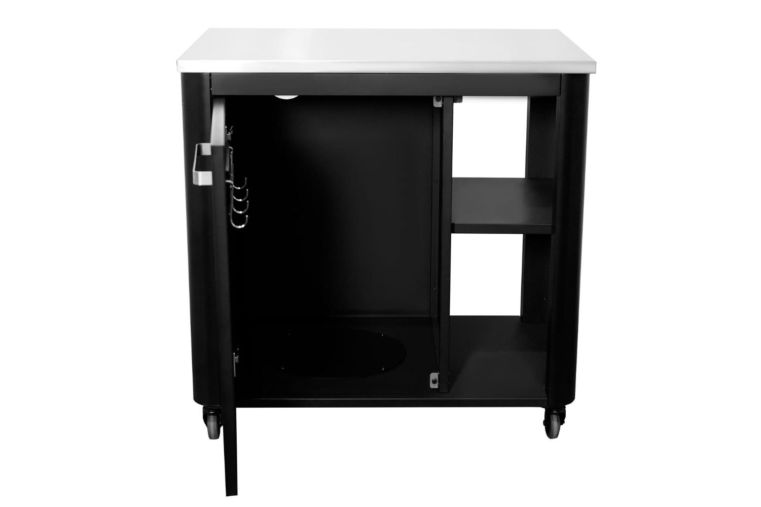 Modul je vybaven praktickým úložným prostorem s dvířky, policí a držákem na plynovou láhev. Nechybí ani 6 háčků na grilovací náčiní, takže budete mít vše potřebné vždy po ruce. Díky čtyřem kolečkům s brzdou lze celý modul snadno přesouvat a bezpečně zajistit na místě.