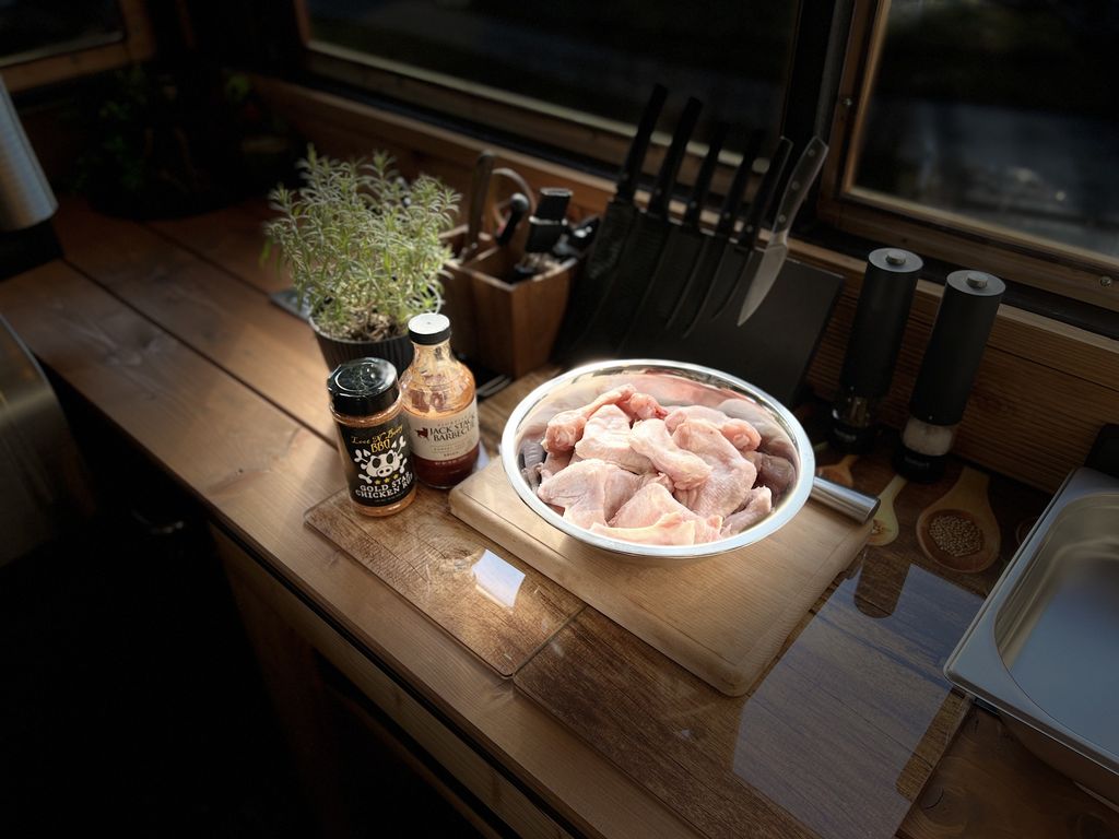 - Kuřecí křídla rozpůlíme na 2ks. Pokud naše křídla obsahují letky, tak je odřízneme a připravíme si z nich např. kuřecí vývar.