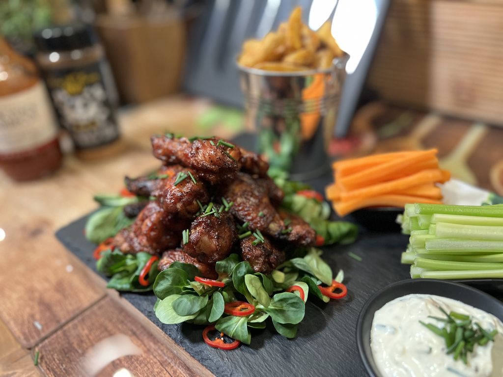- BBQ kuřecí křídla jsou hotová! Skvěle se k nim hodí hodí řapíkatý celer, který společně s mrkví nakrájíme na úzké hranolky.