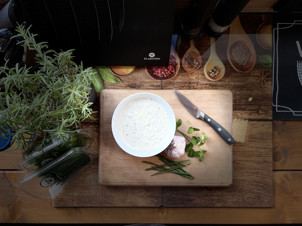 - Do misky dáme zakysanou smetanu a majonézu. Pažitku a koriandr lehce pokrájíme, rozmarýn nasekáme na jemno. Vše přidáme do misky. Česnek oloupeme, prolisujeme a přidáme ke zbylým surovinám. Na závěr přidáme pepř, dle chuti osolíme, promícháme a dáme vychladit do lednice.