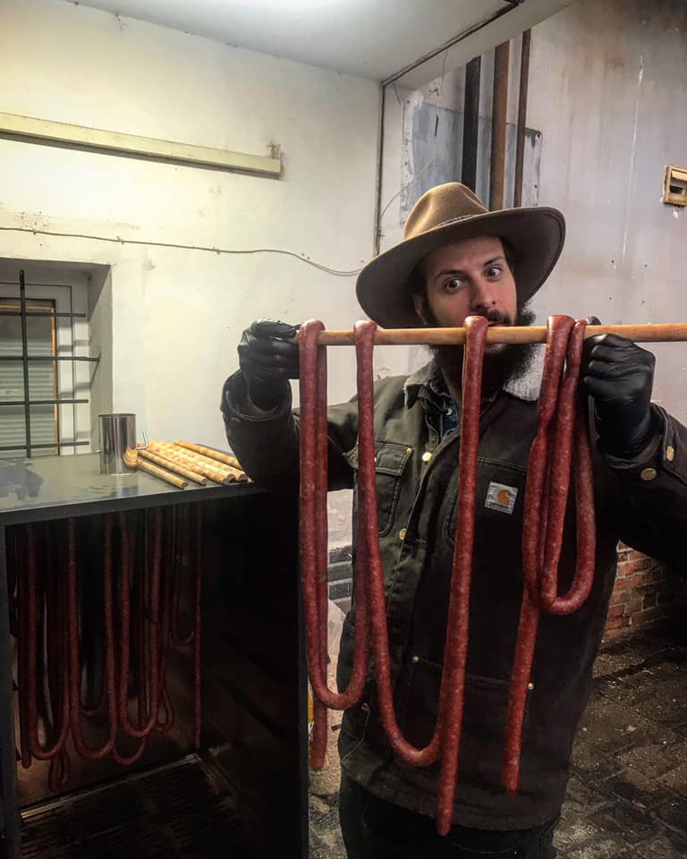 - Do vyhřáté udírny vložíme klobásy – můžeme použít háčky nebo klobásy zavěsit přímo na tyčky. Ideální je nařezat si klobásy na páry – nejen, že to lépe vypadá na fotky na Instagramu, ale také se vám kouř dostane rovnoměrně ke každému záhybu klobásy. 😊 Nebojte se, i já jsem se to musel naučit. Takže první pověšené anakondy po celé udírně jsou povoleny.