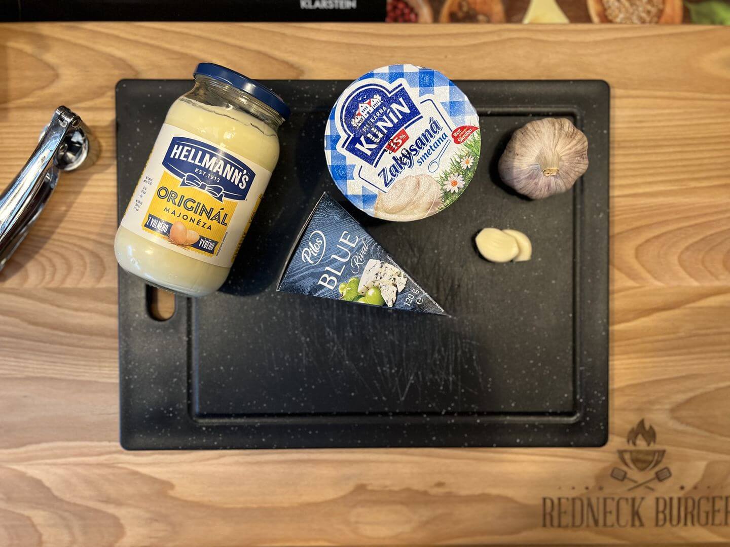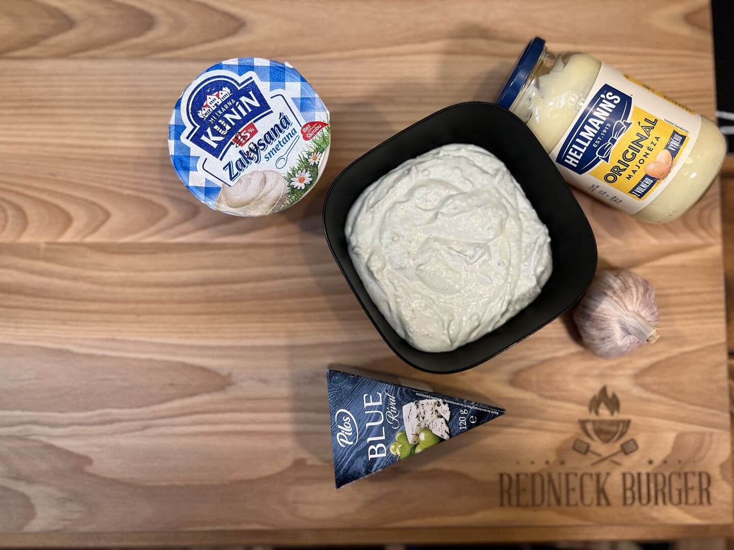 - Sýr pokrájíme na menší kousky a vložíme do mixéru. Dále do mixéru přidáme zakysanou smetanu, majonézu a prolisovaný česnek.