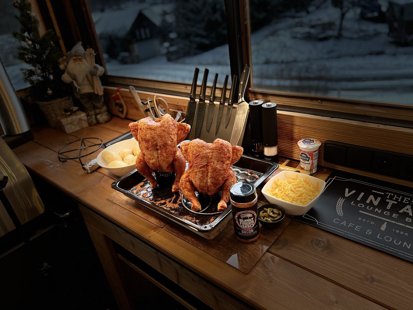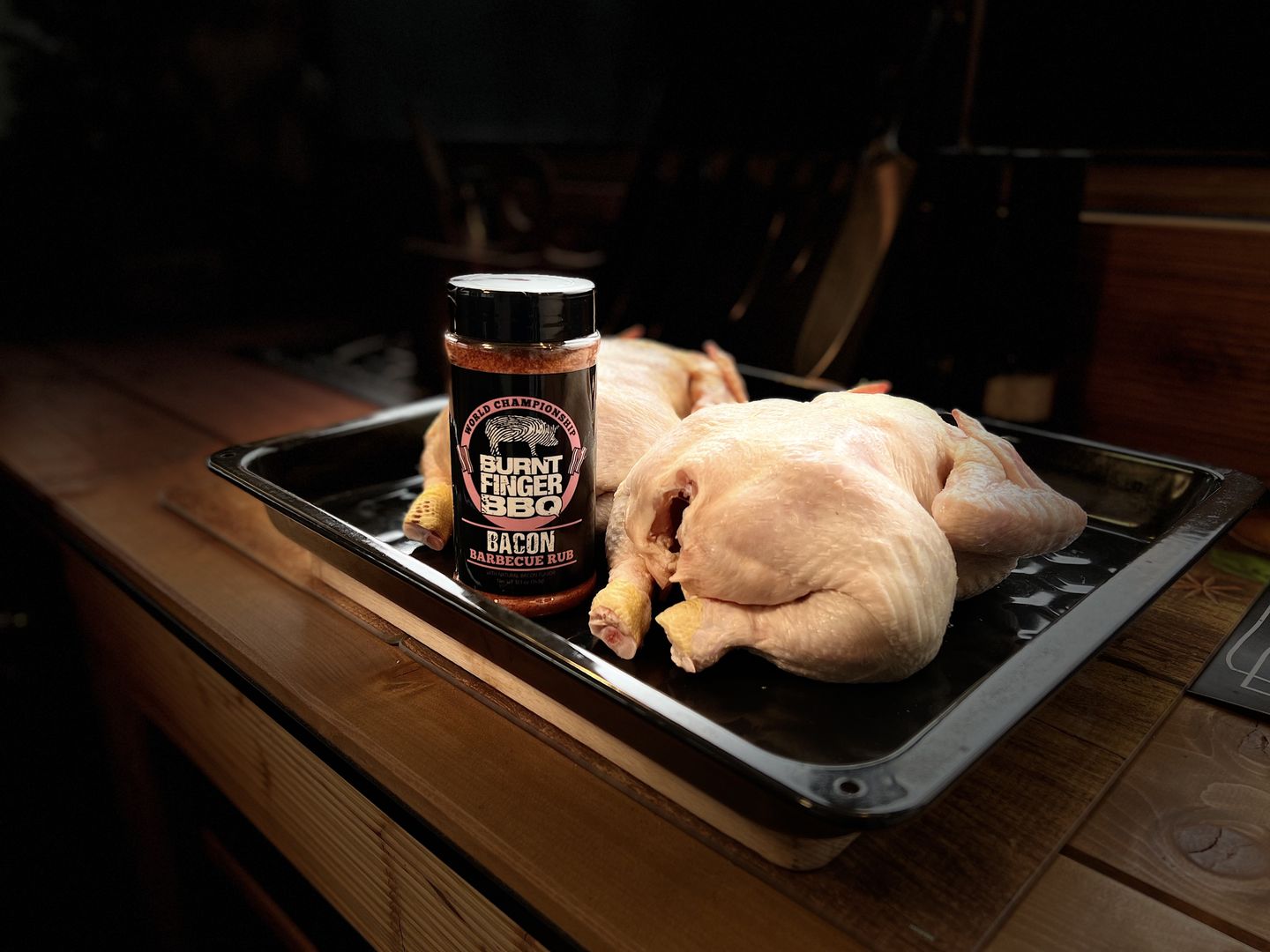 - Očištěné kuře dobře osušíme papírovou utěrkou, osolíme ze všech stran a také zevnitř. Kuře důkladně okořeníme Bacon rubem, kterým důkladně vytřeme i vnitřek kuřete (TIP: prsty se opatrně dostaneme pod kůži, kterou opatrně začneme oddělovat od masa po celém obvodu kuřete, pod kůži pak nasypeme BACON RUB a rozetřeme – maso bude mít mnohem lepší chuť).