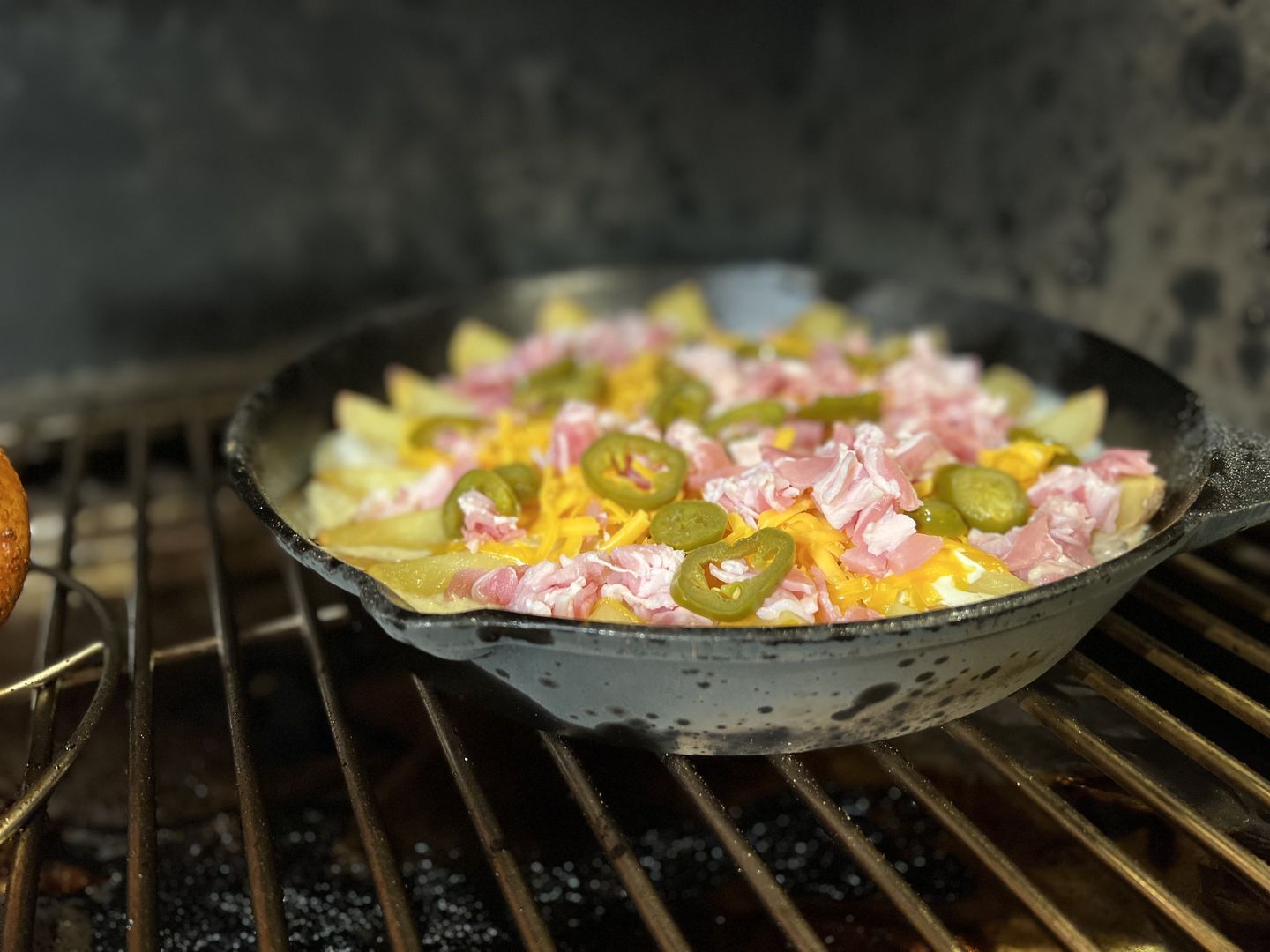 - Očištěné brambory nakrájíme na čtvrtky, slaninu na kostičky, a pokud nemáme jalapeno papričky již nakrájené, tak je nakrájíme na kolečka. Po 1h grilování kuřete vložíme litinovou nebo jinou pánev do grilu a vytřeme jí olejem. Do pánve naskládáme brambory, přikryjeme alobalem a necháme grilovat společně s kuřetem 1 hodinu na 170 °C.